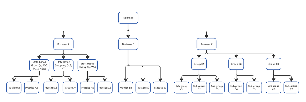The business-based or sub-group levels would represent head office staff that may require overview of all practices, such as the compliance team and/or group CEO or manager.