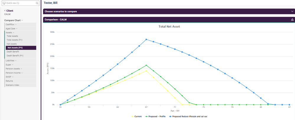 This feature allows you to select any of your Xtools+ (CALM) scenarios and view their projected outcomes, like Net Assets, Cashflow, or Asset Allocation, on the same graph. It’s perfect for viewing 'current position' versus a 'recommended strategy,' or for comparing two different strategic options. By presenting the data this way, you create a compelling and easy to understand narrative for your clients, helping them clearly see the long-term benefits of your recommendations. It simplifies complex information and brings your advice to life in a tangible way.